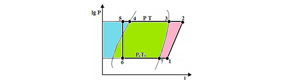 1-2 – сжатие в компрессоре; 2-3 – охлаждение в теплообменнике внешнего блока; 3-4 – конденсация в теплообменнике внешнего блока; 4-5 – переохлаждение в теплообменнике внешнего блока; 5-6 – дросселирование в дросселирующем устройстве; 6-7 – кипение в теплообменнике внутреннего блока; 7-1 – перегрев в теплообменнике внутреннего блока.